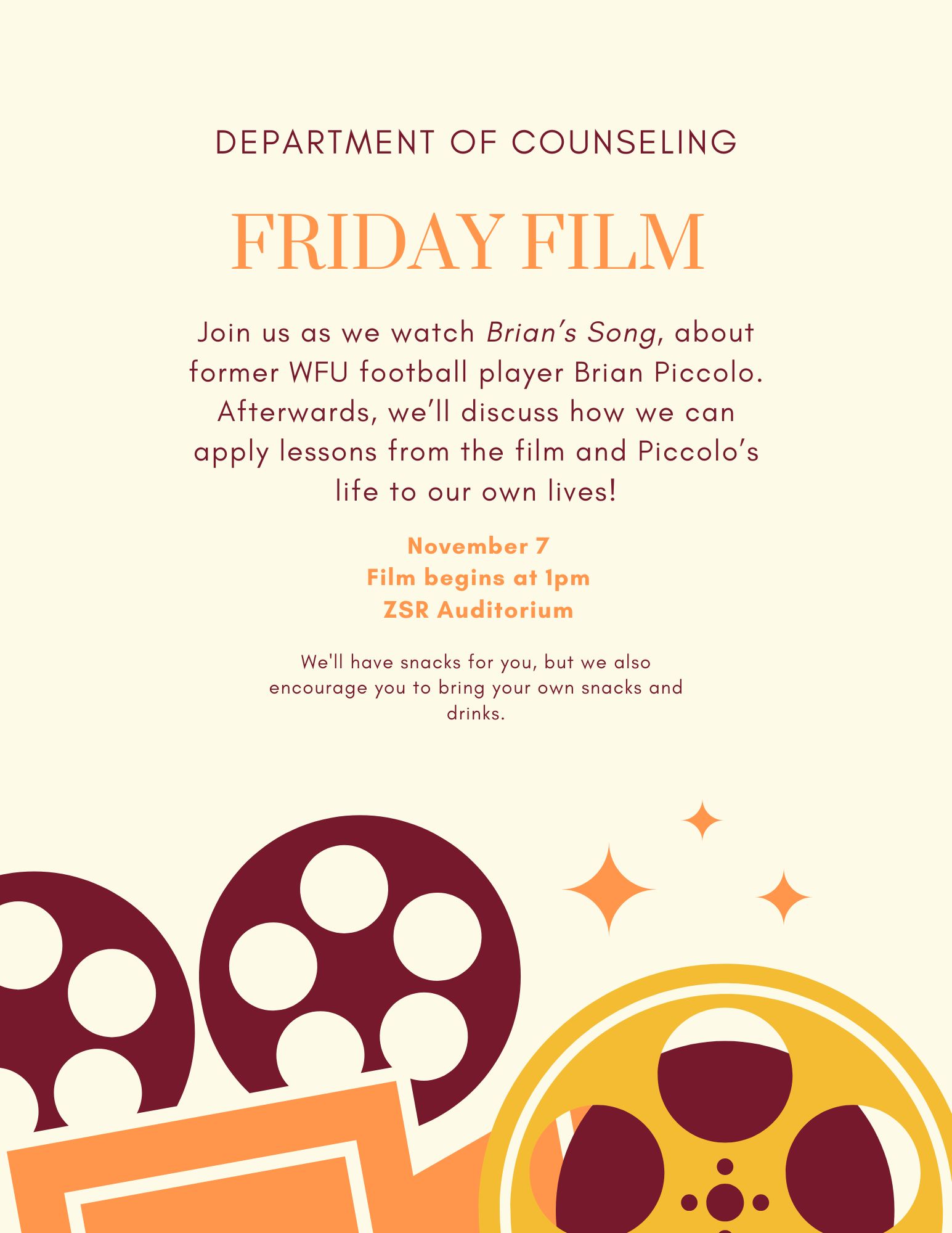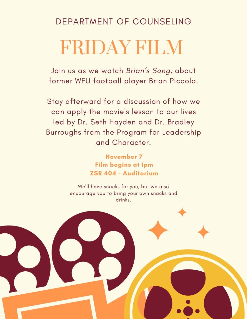 We’ll be screening Brian’s Song, a film about the life of former WFU football player Brian Piccolo. After the film we will discuss ways we can apply lessons from his life to our own.