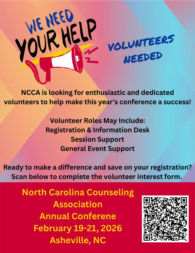 Scan below to complete the volunteer interest form for the North Carolina Counseling Association Annual Conference February 19-21, 2026 in Asheville, NC.